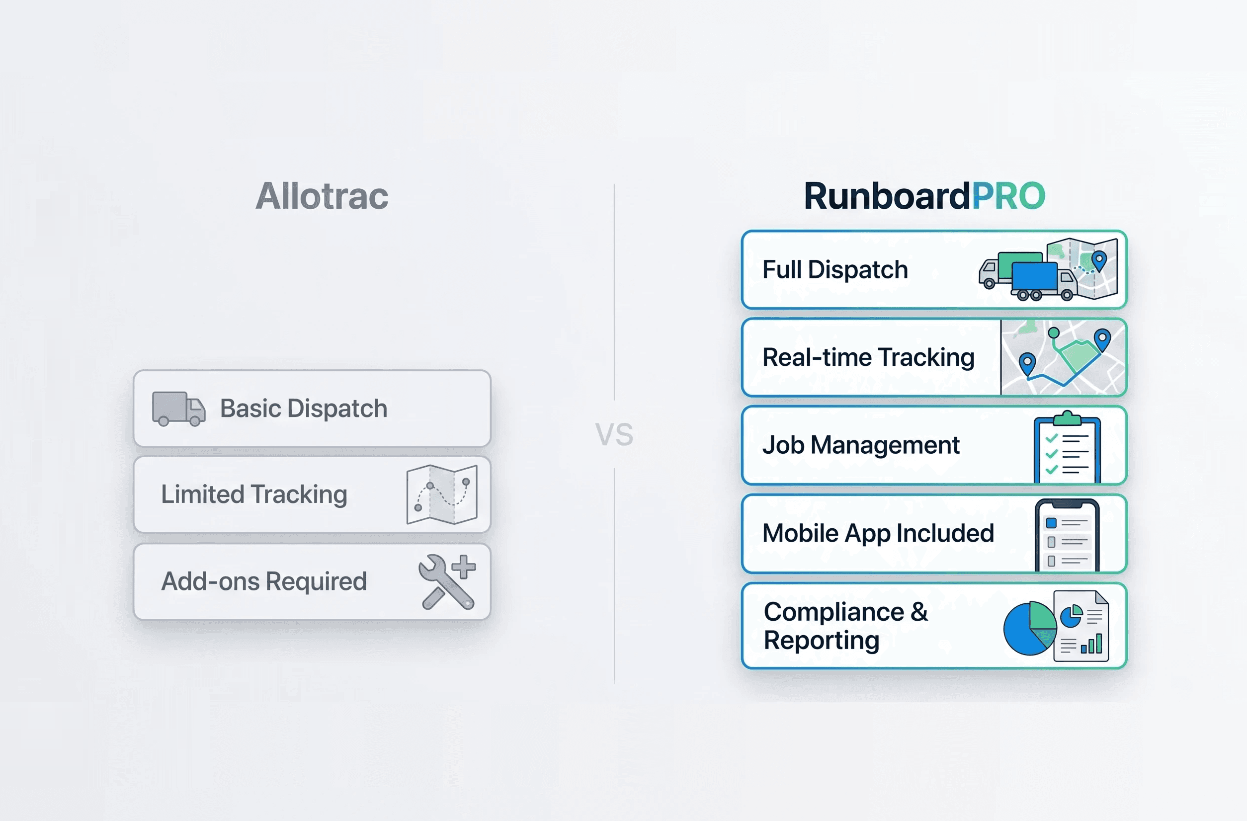 RunboardPRO vs Allotrac — Full Dispatch Power. Better Value Per Vehicle.