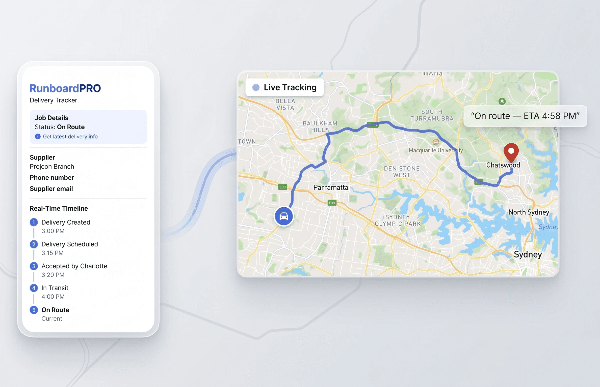 Track drivers, jobs, and updates live with map view, ETAs, and full dispatch visibility — built for real-time operations.